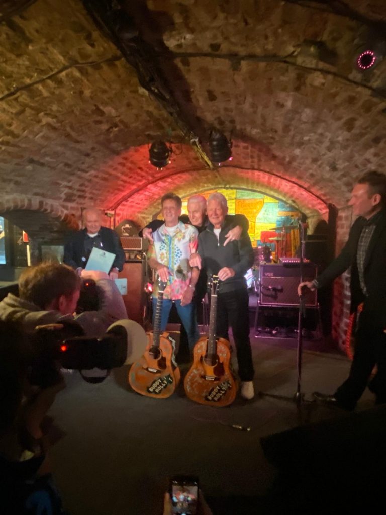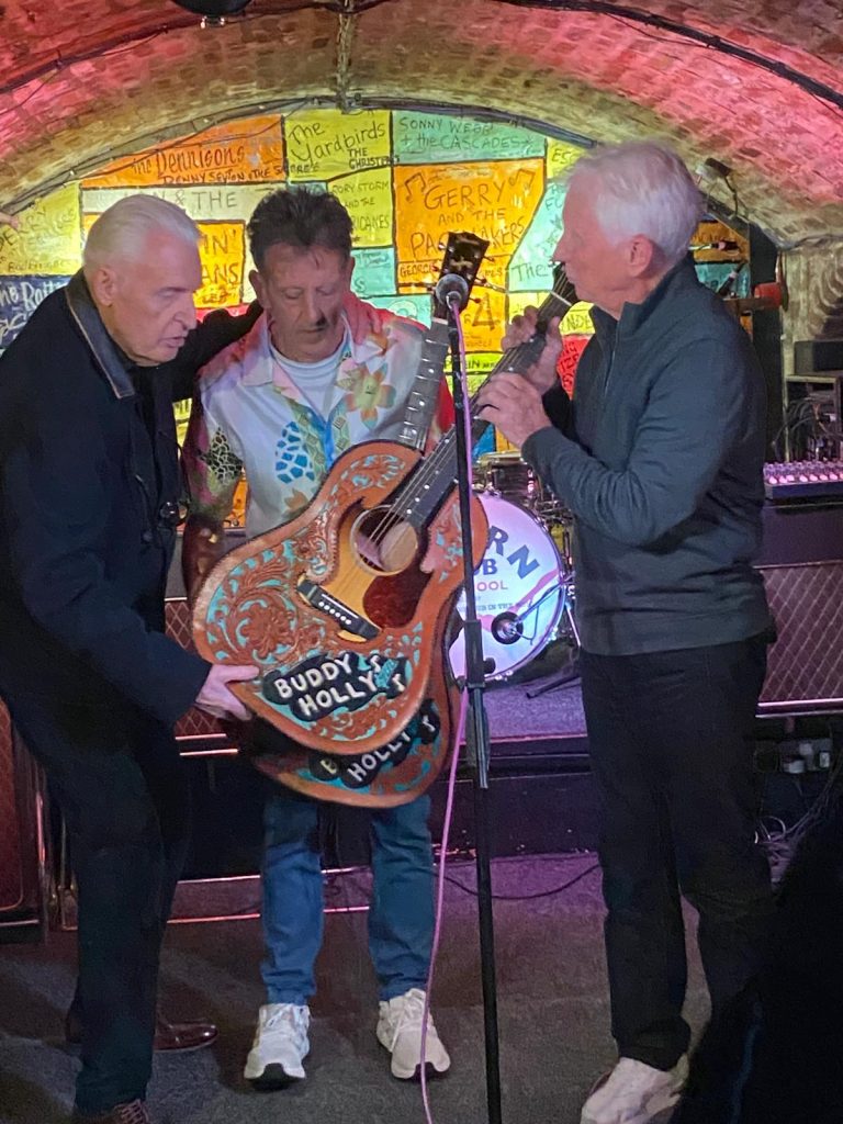 I vaguely hinted in an earlier post that John and I were due to attend a presentation in Liverpool and that I would fill you in on the happenings as and when it happened. Well, the occasion finally took place yesterday (October 10th 2025) at the world famous Cavern Club in Mathew Street, Liverpool where he and I were presented with custom made guitars by the Buddy Holly Educational Foundation in recognition of The Searchers’ contribution to the world of popular music through the decades and also to celebrate the influence that the music of the late and very great Buddy Holly had on our recordings. Indeed the band has covered quite a few Holly hits and album tracks over the years and as you know our “supposedly ad lib” Buddy segment has featured constantly in our stage act, including that momentous show at Glastonbury in June this year, and John and I happily pay homage to one of the greatest rock and roll icons there has ever been.