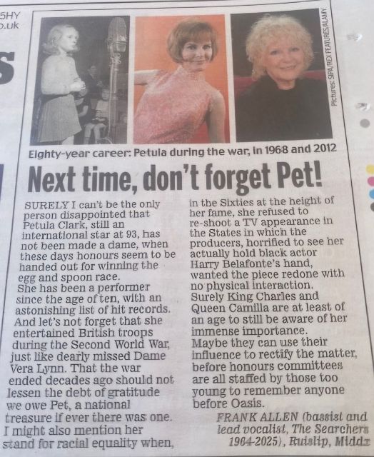 Anyway, all that apart, I do hope the someone rectifies the Petula Clark situation before she is no longer with us to enjoy the most deserved honour. It should have been done years ago.