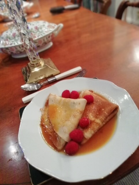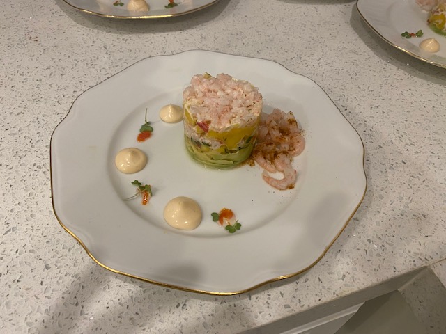 My cook Lisa provides the main course and serves all the dishes while the starters and puds are in my domain. I used to do the wole shebang but that meant being away from my guests too much so this set up works so much better. Alas I didn’t manage to snap Lisa’s superb Cajun Salmon dish (absolutely delicious) so you’ll have to settle for my starter and dessert. Plus of course a half decent pic of the ensemble.